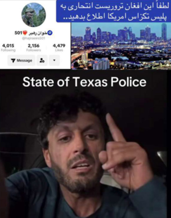 #AMERICA ਅਫਗਾਨ ਨਾਗਰਿਕ ਵੱਲੋਂ ਅਮਰੀਕੀਆਂ ਨੂੰ ਮਾਰਨ ਲਈ ਸੋਸ਼ਲ ਮੀਡੀਆ ‘ਤੇ ਪੋਸਟ ਕੀਤੀਆਂ ਗਈਆਂ ਧਮਕੀਆਂ ਟੈਕਸਾਸ, 3 ਦਸੰਬਰ (ਪੰਜਾਬ ਮੇਲ)- ਟੈਕਸਾਸ ਦੇ ਫੋਰਟਵਰਥ ਵਿਚ ਰਹਿਣ ਵਾਲੇ ਅਫਗਾਨਿਸਤਾਨ ਦੇ ਨਾਗਰਿਕ 30 ਸਾਲਾ ਮੁਹੰਮਦ ਦਾਊਦ ਐਲੋਕੋਜ਼ੇ ਵੱਲੋਂ PUNJAB MAIL USA / 2 months Comment (0) (36)